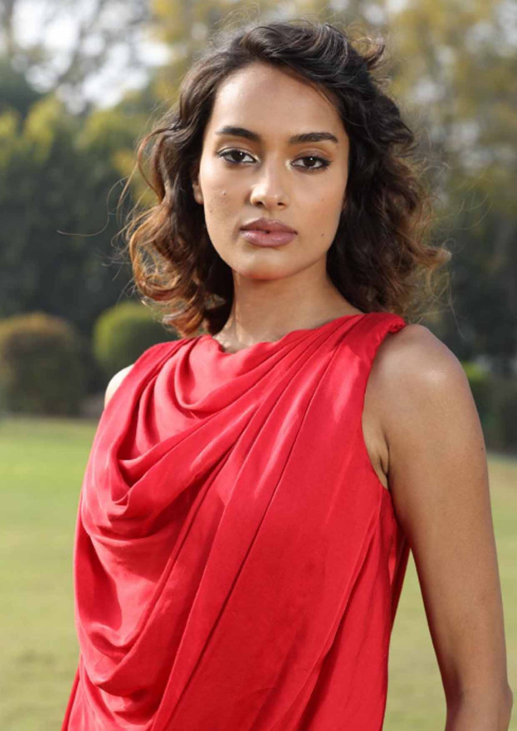Our Whispers of love is Crafted in a rich shade of deep red, this cowl drape satin dress is an ode to fluid elegance and romance. Designed to flow effortlessly over the body, the soft cowl drape creates a sensual neckline, while the luxurious satin cascades gracefully, catching light with every movement.