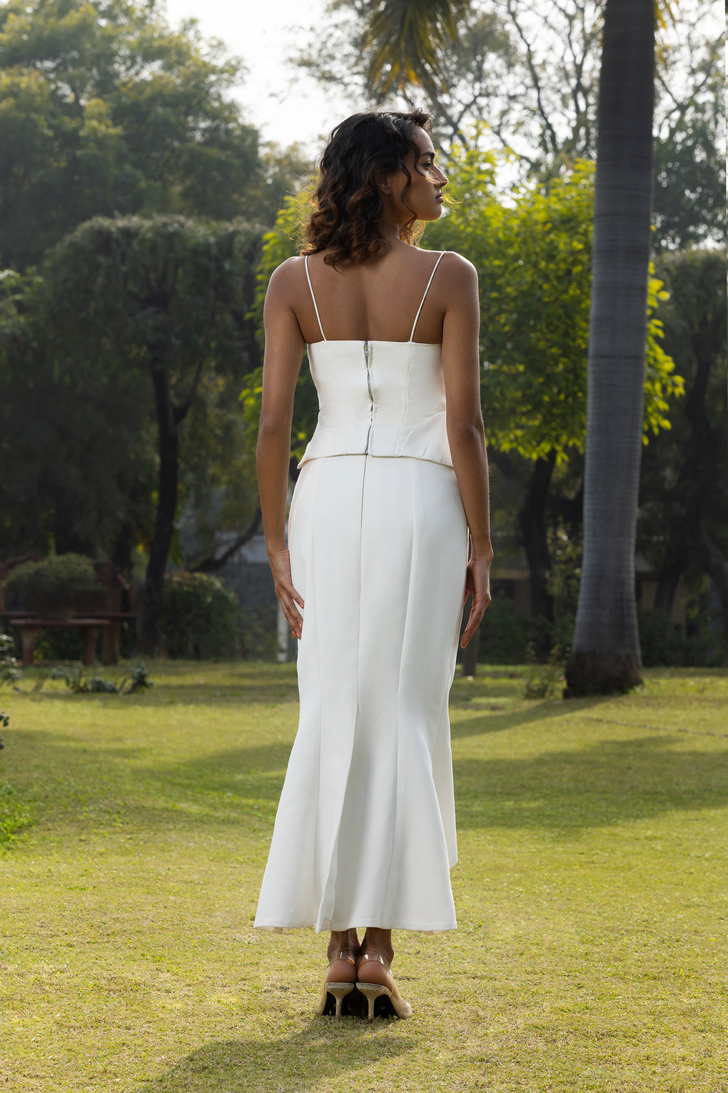 Style this co-ord with a sleek bun or ponytail, a statement clutch for a sensual and refined look.