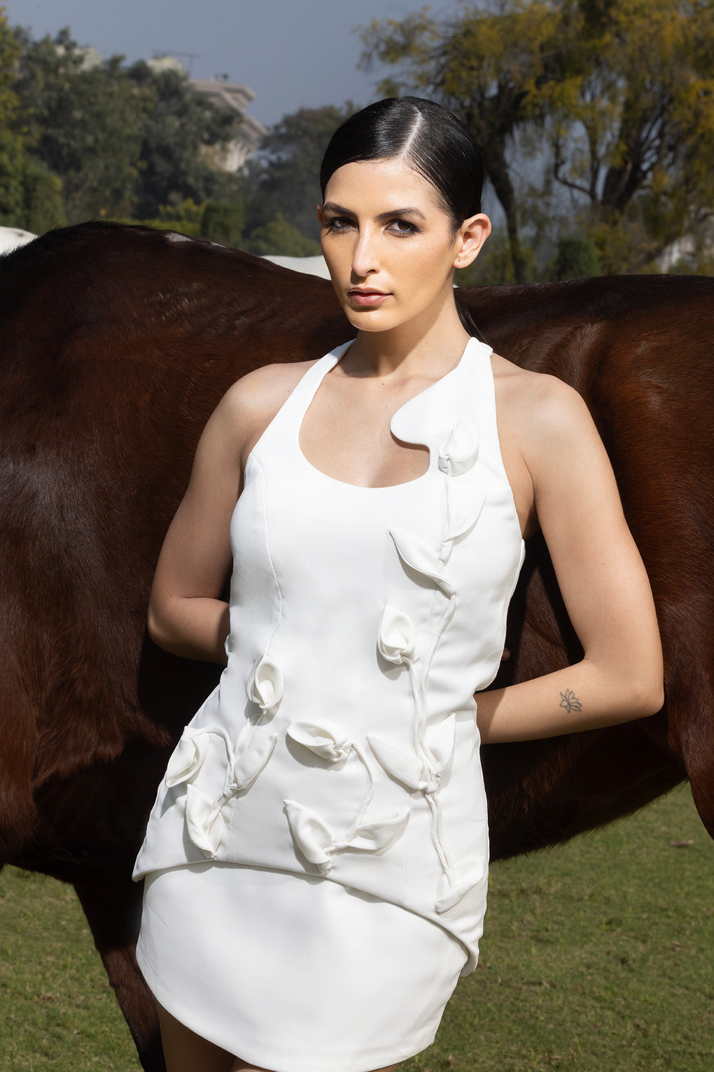 The skirt is elevated with a delicate floral statement at the hem, adding a subtle romantic detail that catches the eye with every step. The contrast of crisp white with the soft floral accent creates a look that is serene yet striking perfect for sunlit brunches, intimate celebrations, or elevated day-to-night styling.
