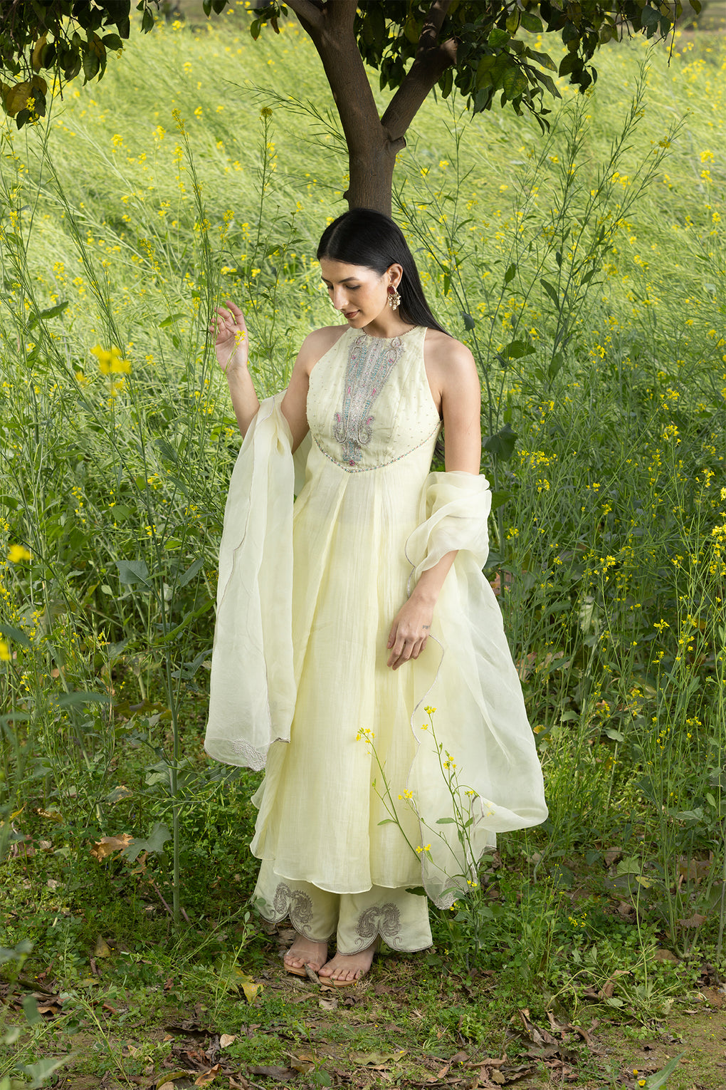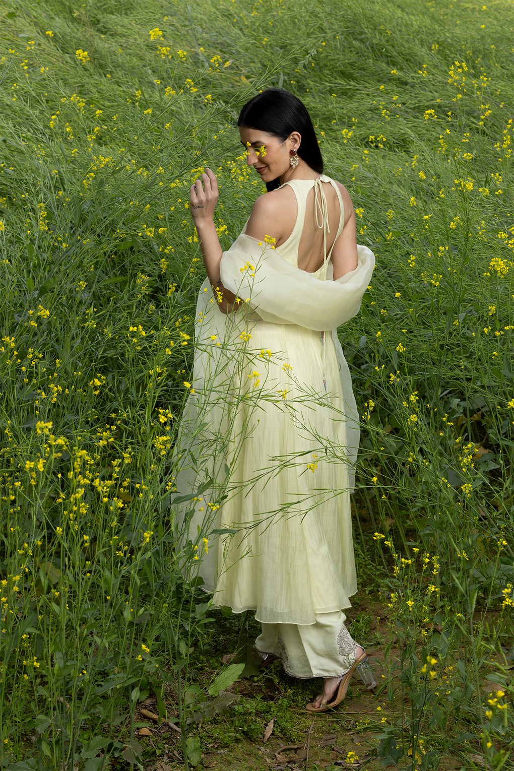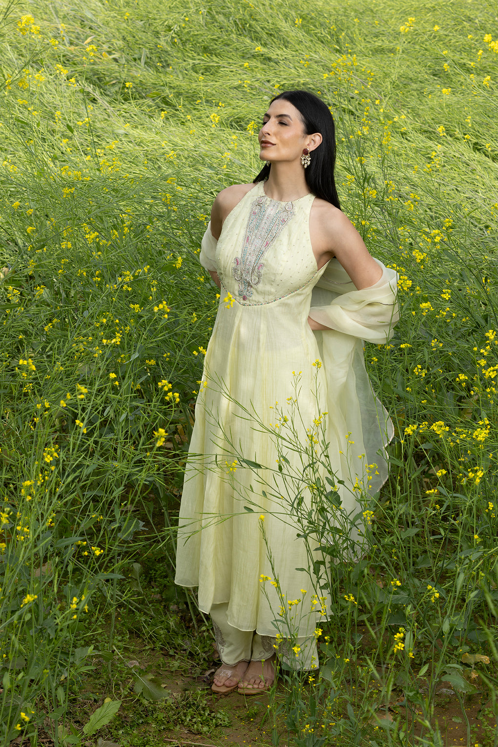 Our Ziyaara Anarkali Kurta Set is rendered in a serene pastel lemon hue, creating a fluid and elongated drape that feels both romantic and refined.