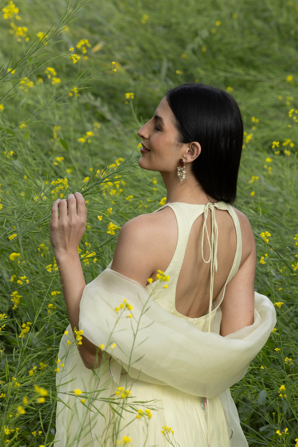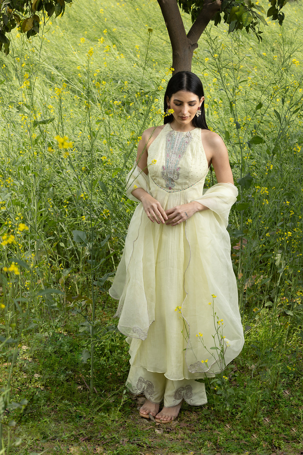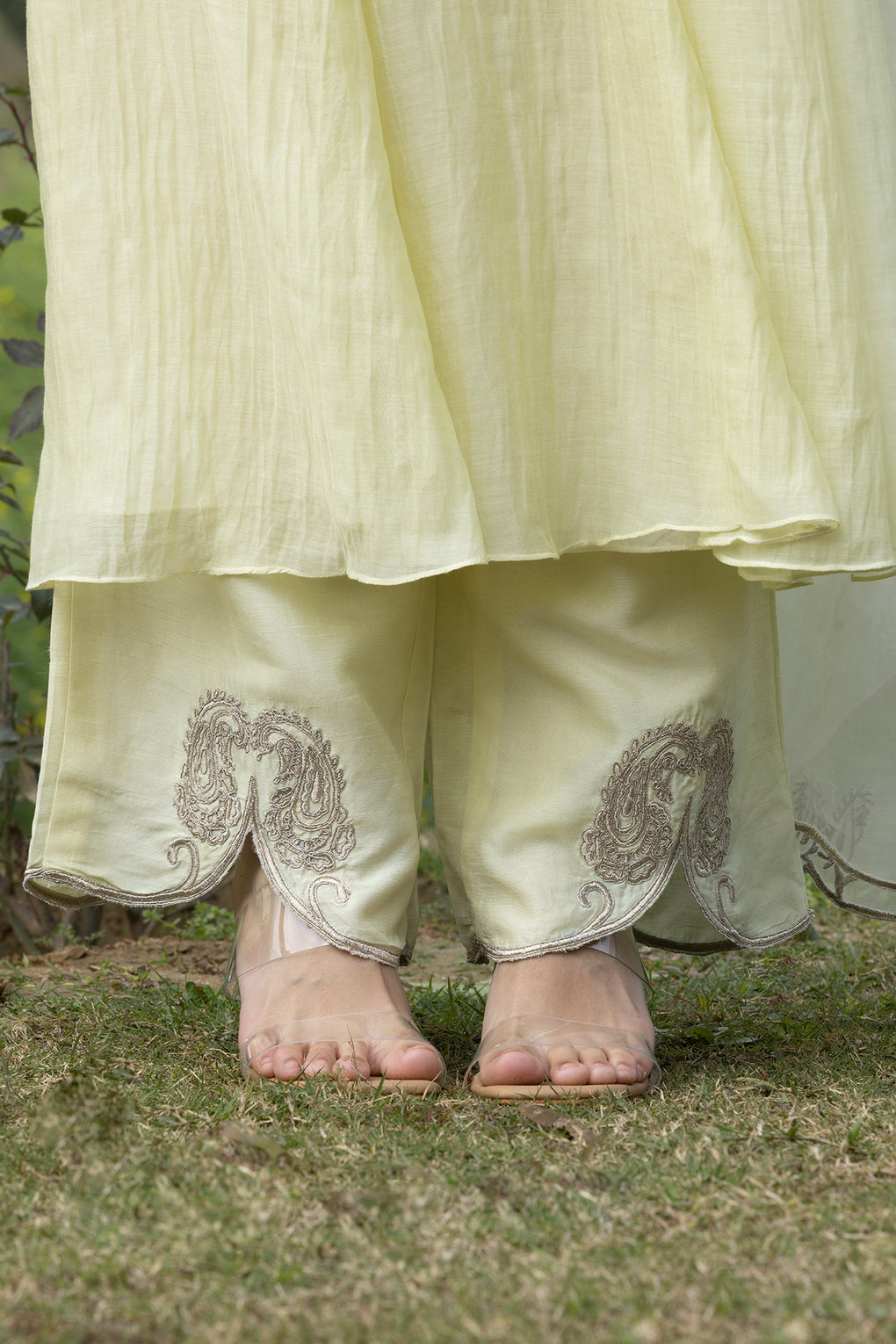 Our Ziyaara Anarkali Kurta Set is rendered in a serene pastel lemon hue, creating a fluid and elongated drape that feels both romantic and refined.