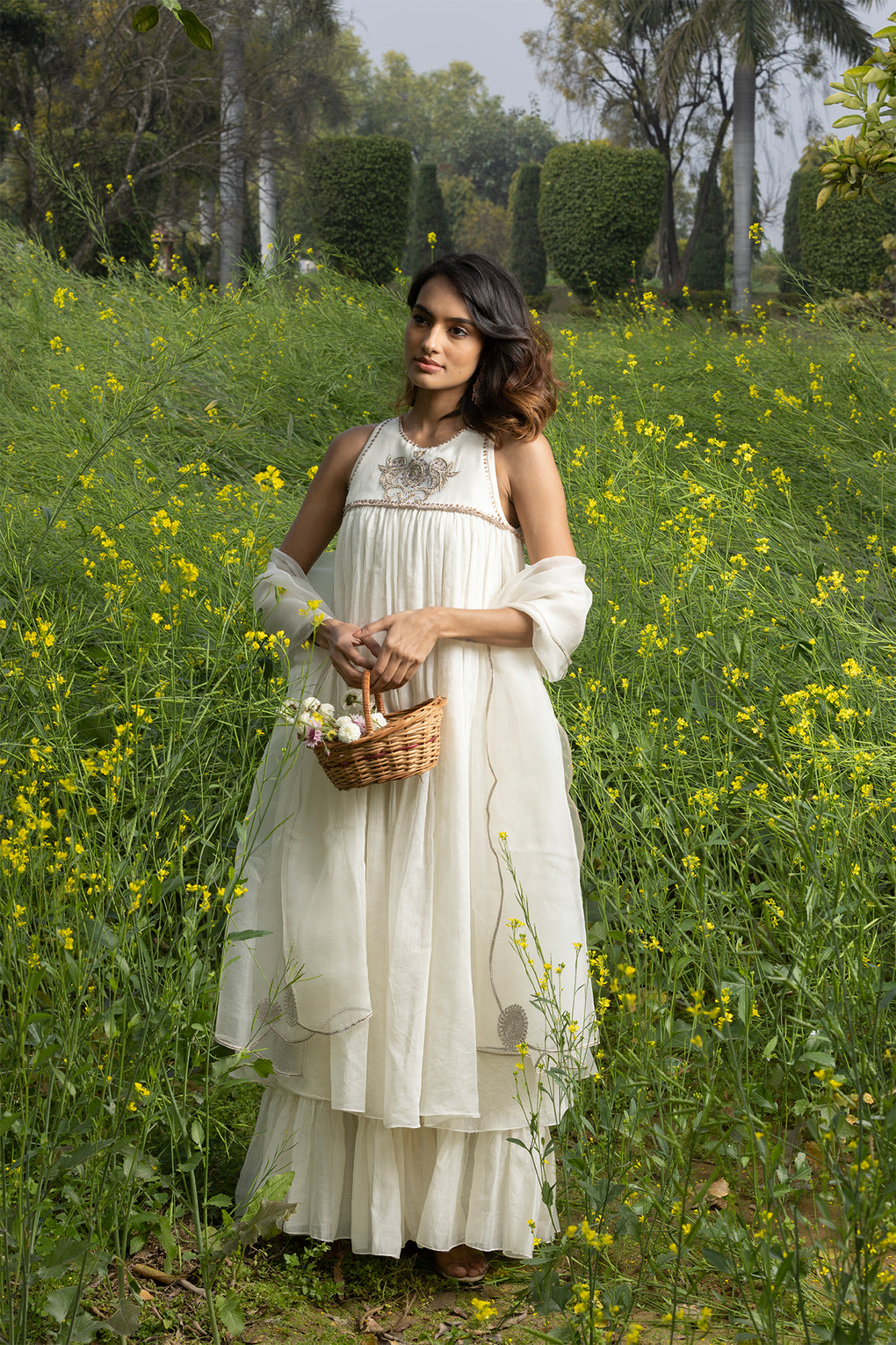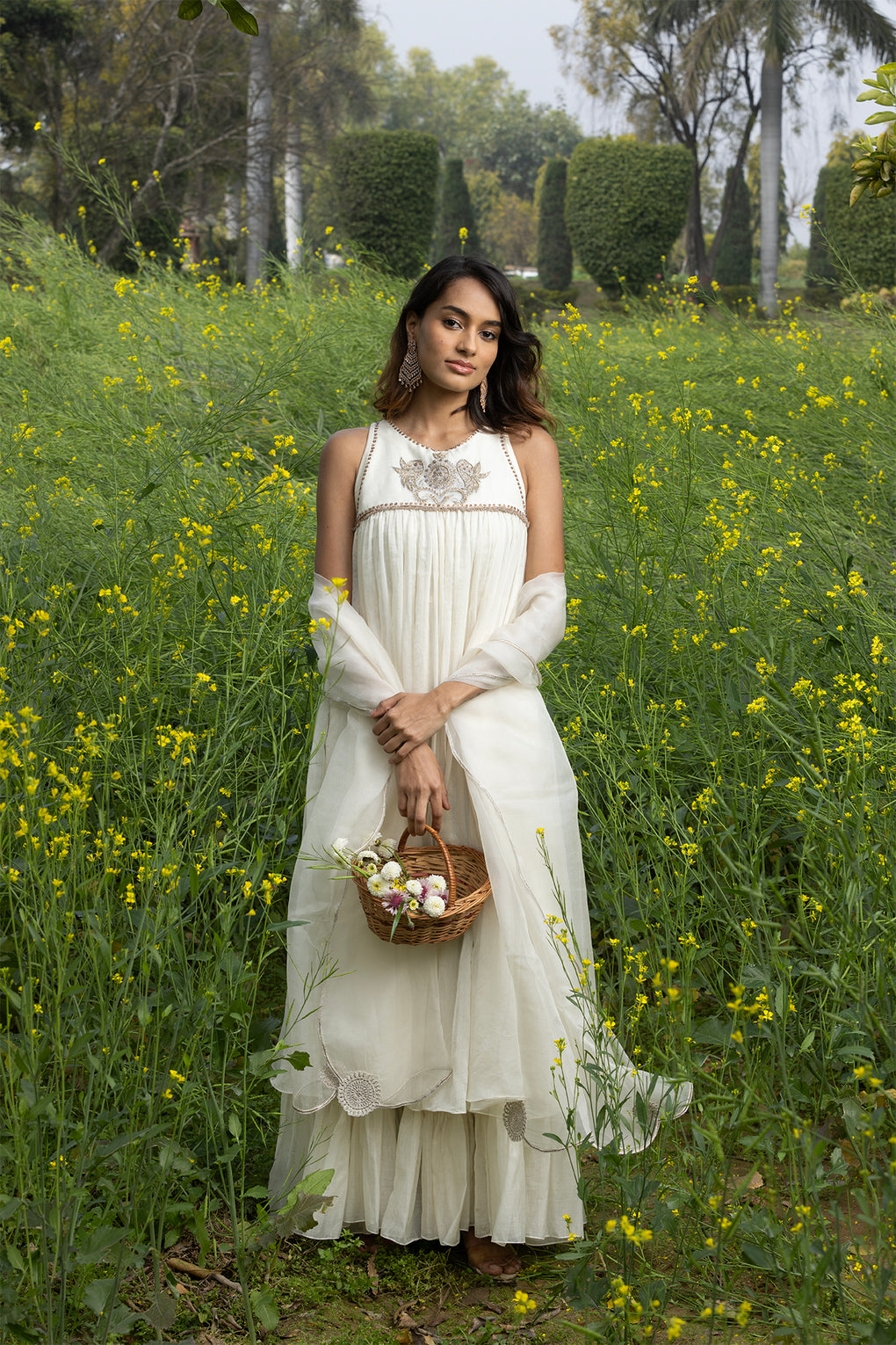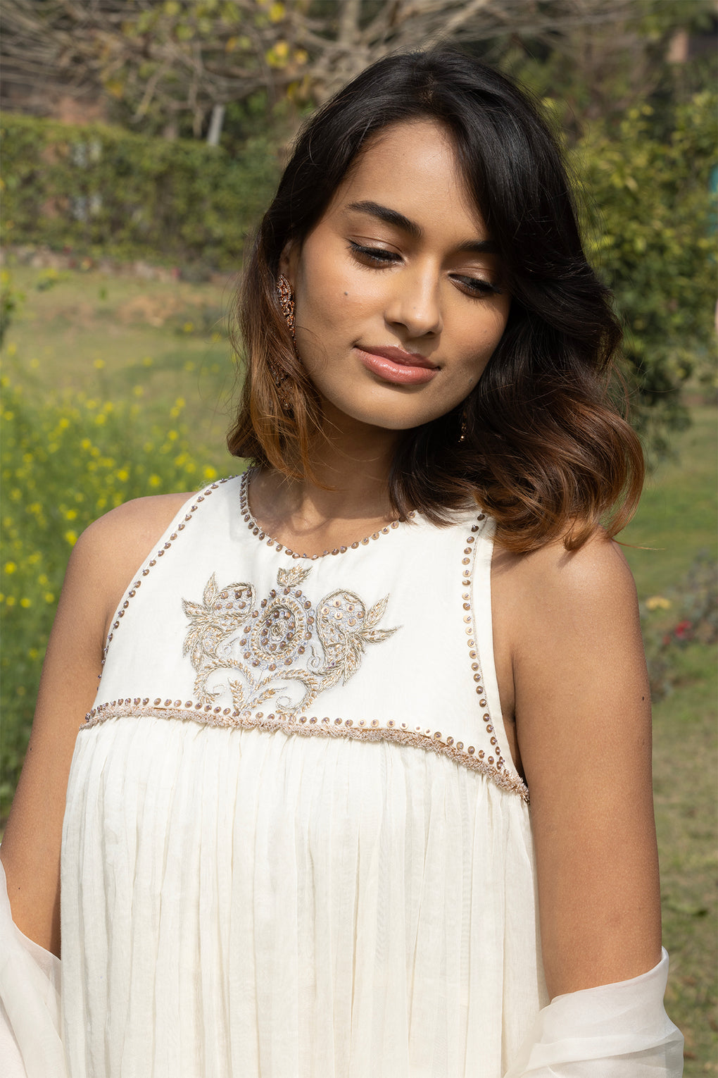 Our Noorjahan Anarkali Kurta Set is crafted in a soft off-white neutral tone, celebrating fluid elegance. The zardozi and the thread work detailing on the neckline accentuating the entire look. The drape falling from the upper front is giving a dramatic touch.