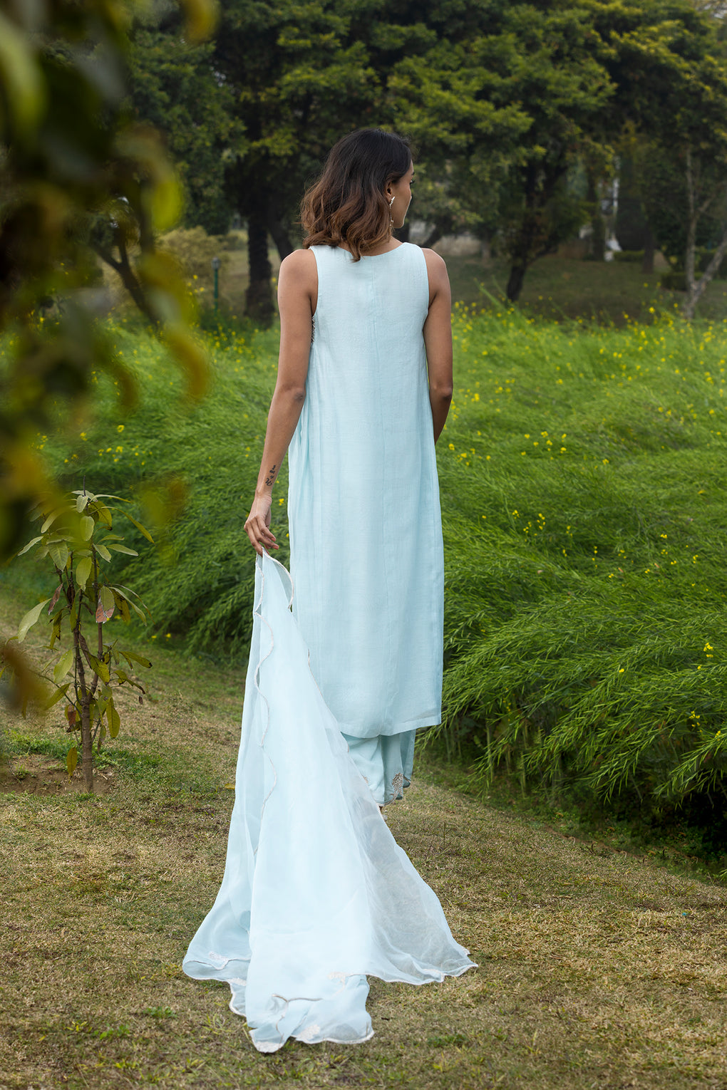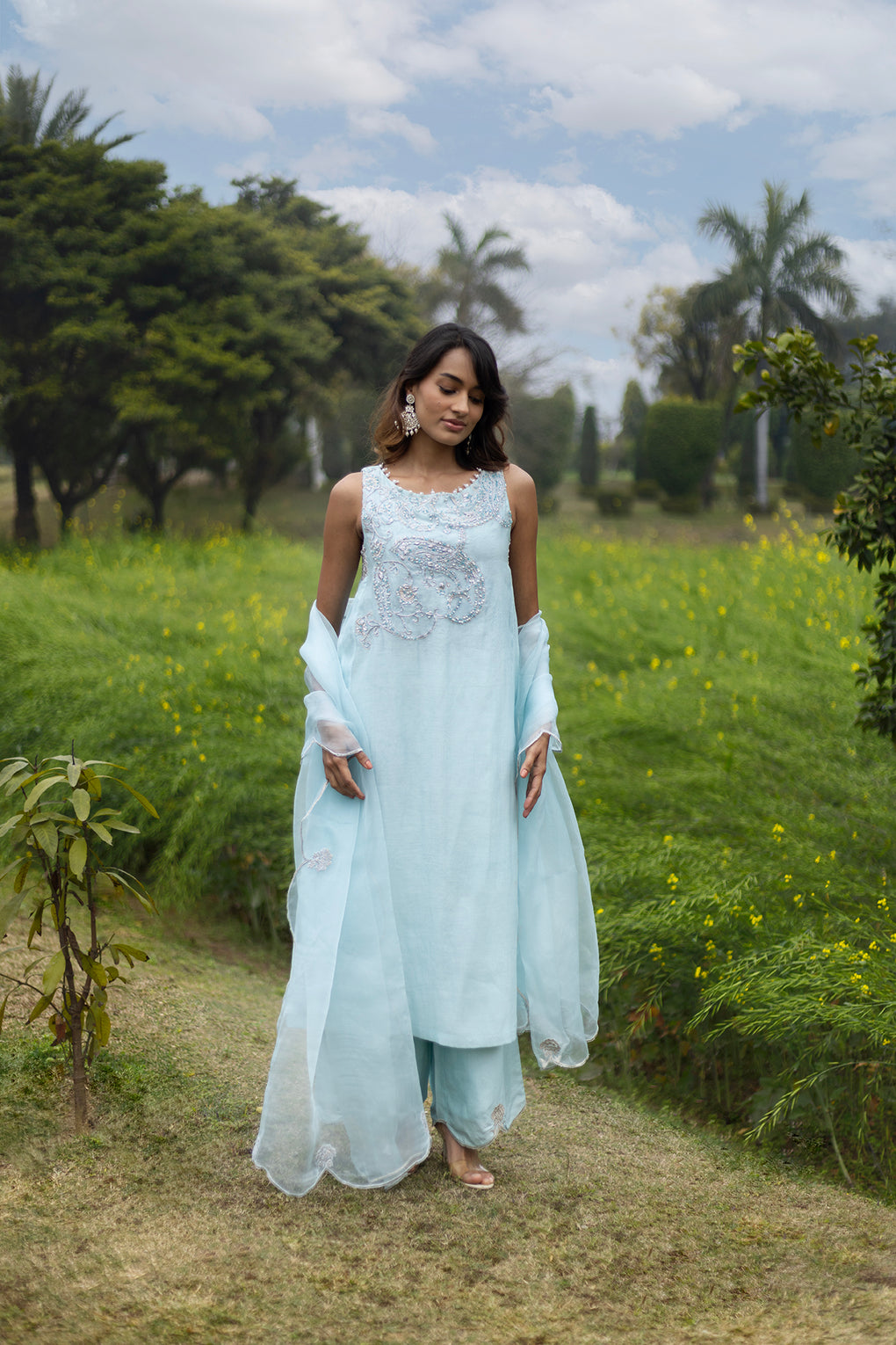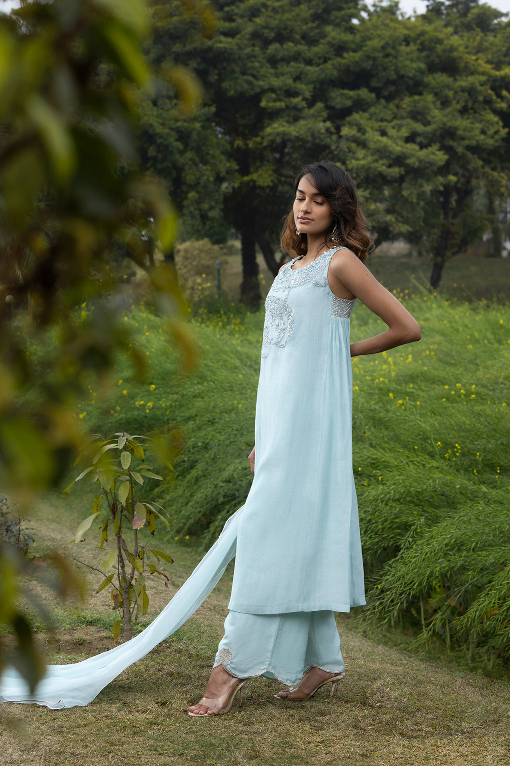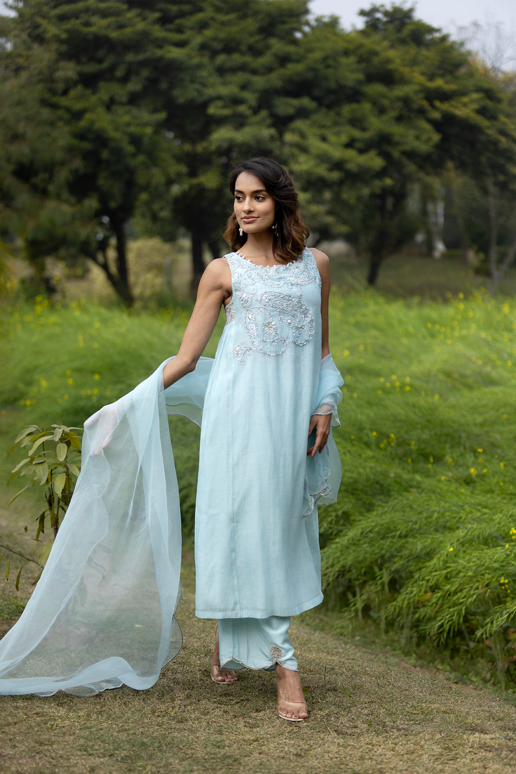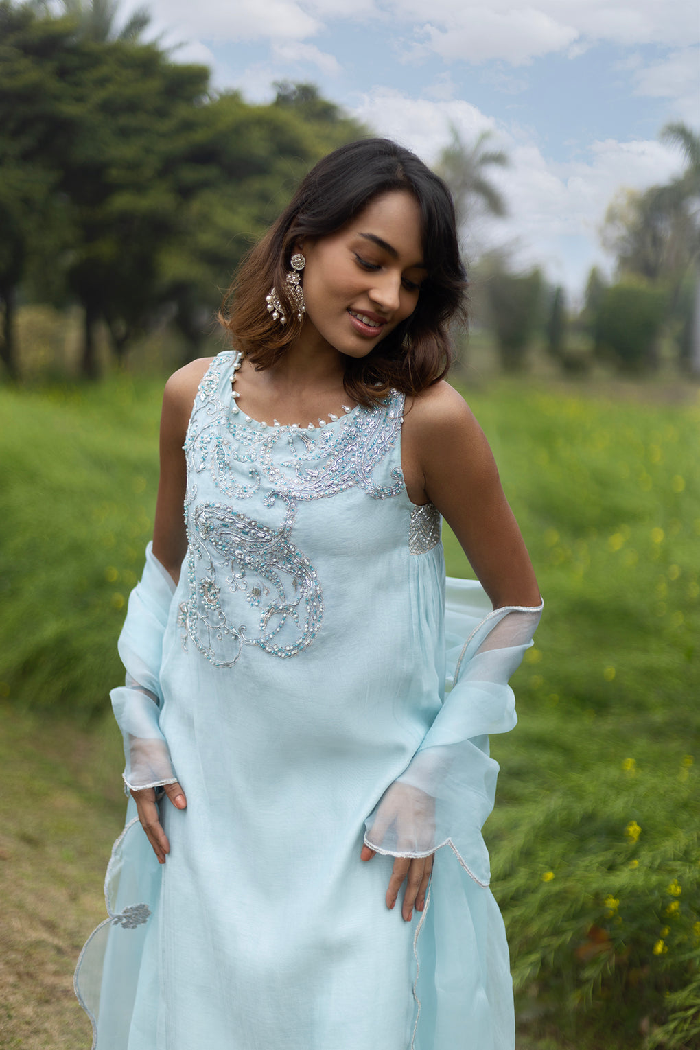 Neela Asman in Powder Blue is an ethereal Indian ensemble, thoughtfully handcrafted in silver thread work and small pearl accents. Delicately adorned with intricate hand embroidery, fine thread work, sequins and pearl accents, the kurta features ornate detailing across the neckline, bodice and lending a soft shimmer to the fluid silhouette.