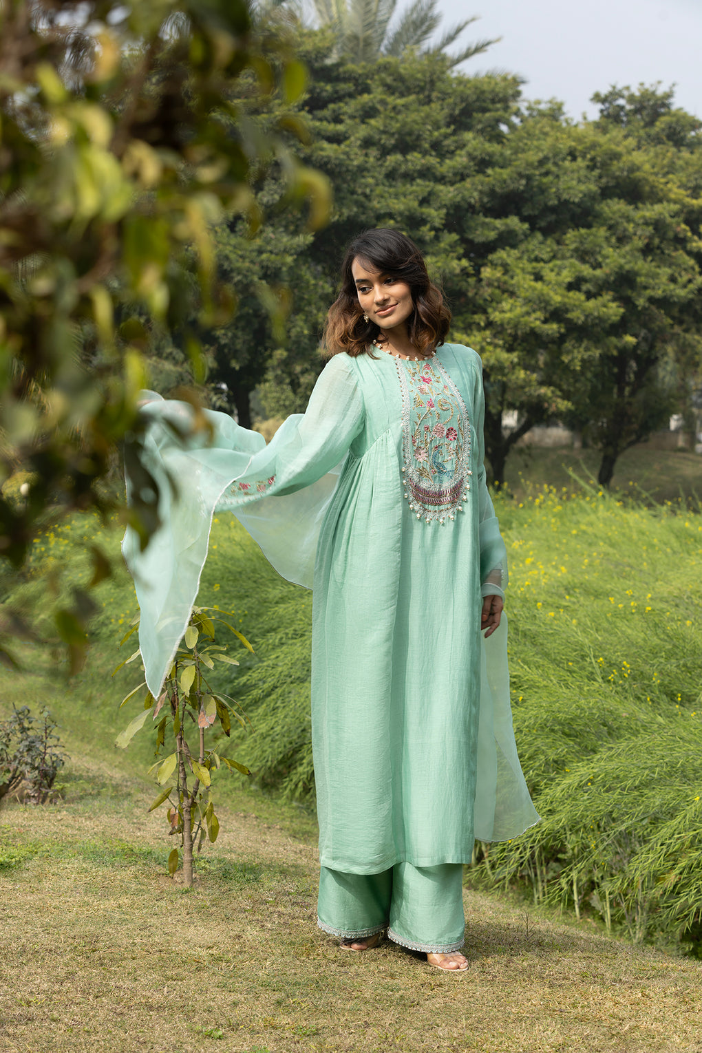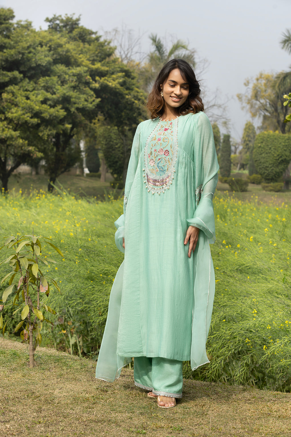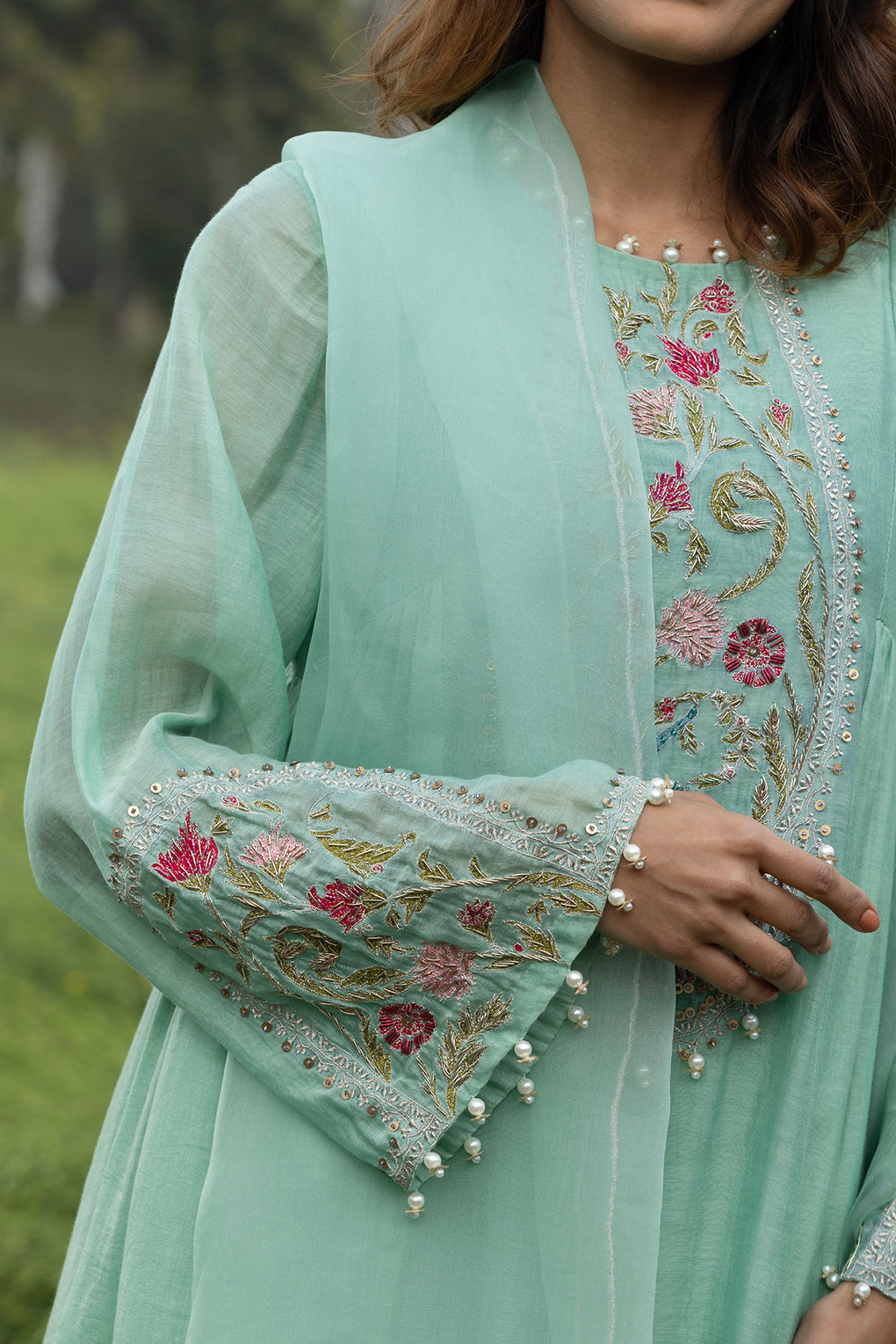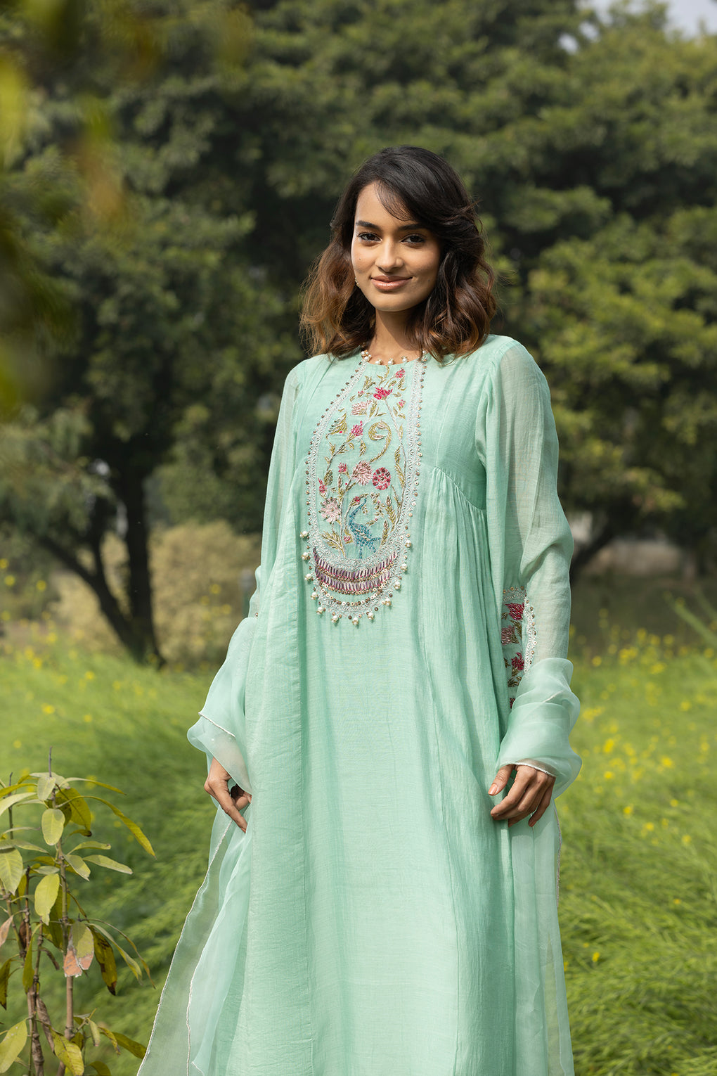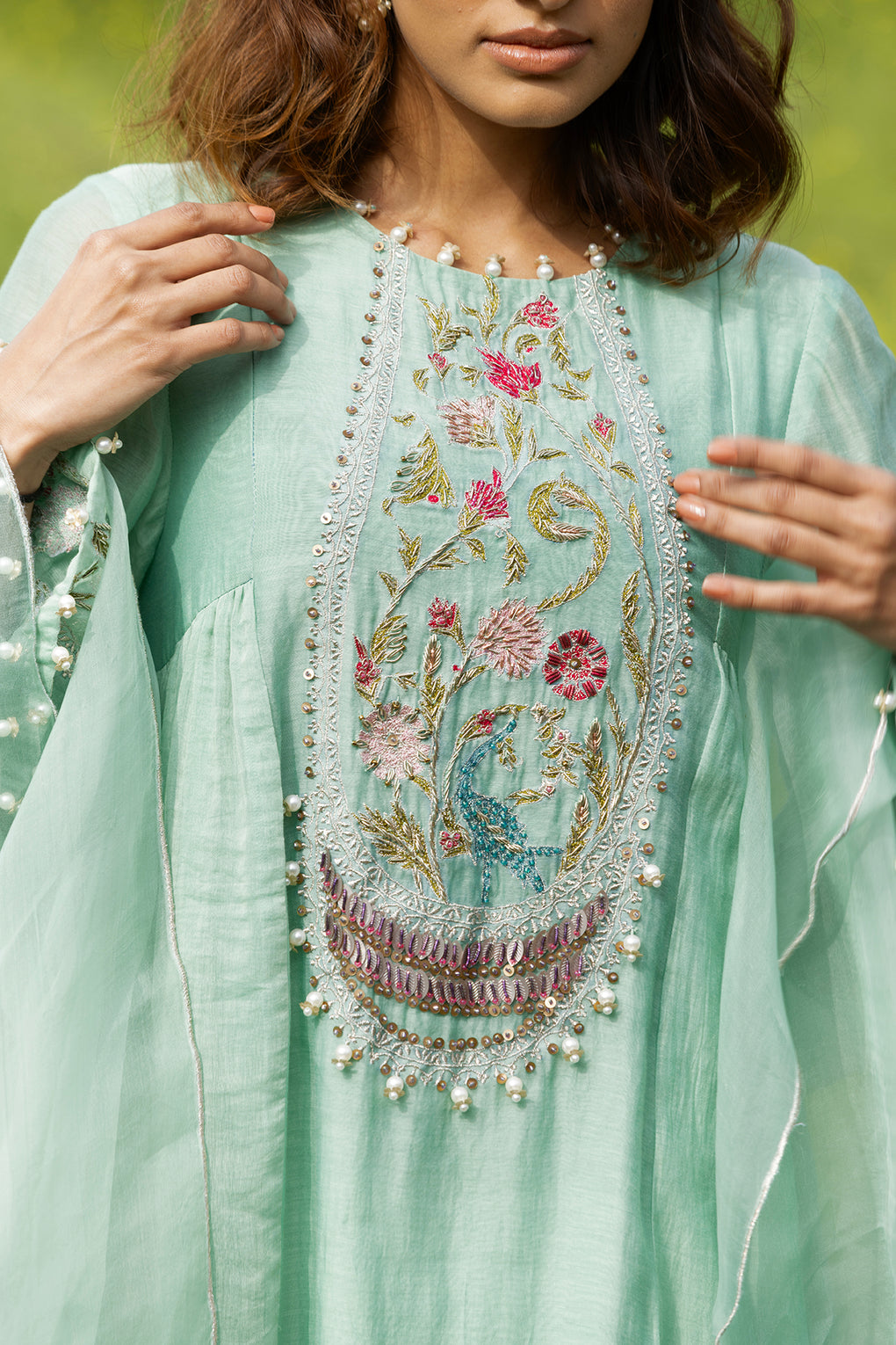 Bagh is an exquisitely handcrafted ,rooted in timeless Indian elegance, this sea Green kurta set is adorned with intricate floral and peacock-inspired hand embroidery, delicately highlighted with sequins, beads, and pearl tassel accents. The silhouette flows gracefully, lending a soft, regal charm perfect for festive gatherings, intimate celebrations.